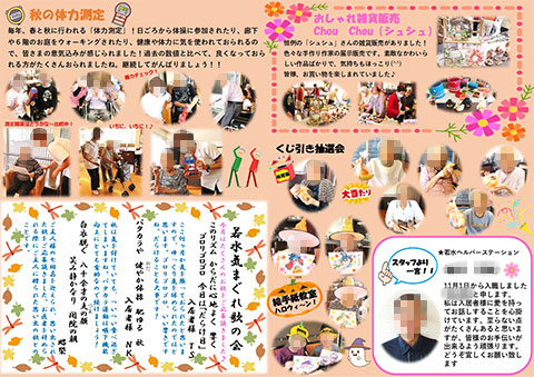 海老や野菜の揚げたての天ぷらに舌鼓を打ちました。また、秋の体力測定の模様や訪問販売の様子を紹介しています。