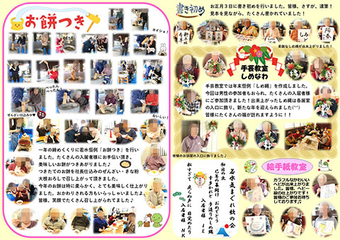 ニューイヤー号ということで、みんなで行ったお餅つきの楽しい様子や、手芸教室で作成した素敵なしめ縄も紹介しています。また絵手紙教室では今年の干支であるヘビがカラフルに仕上がりました。